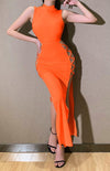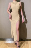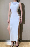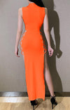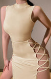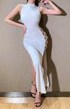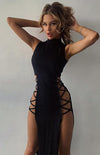 Deze verfijnde maxi jurk met hoge hals en opvallende cut-out details biedt een sexy en elegante uitstraling. Perfect voor glamoureuze avonden, met een strakke pasvorm en hoge split voor een stijlvolle look.