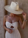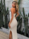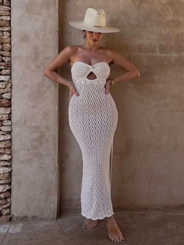 Deze elegante maxi jurk met een tube top en uitsnijding detail biedt een flatterende pasvorm. Perfect voor zomerse stranddagen en feestjes, met een uniek gehaakt patroon dat stijlvol en trendy is.