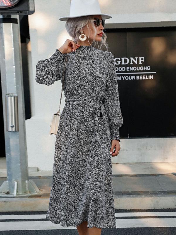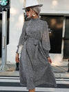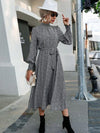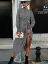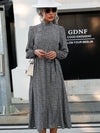 Deze stijlvolle midi jurk met hoge hals en geometrische print biedt een elegant silhouet voor elke gelegenheid. Perfect te combineren met accessoires voor zowel dag- als avondmode.