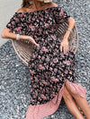 Deze charmante midi jurk met off-shoulder ontwerp en bloemenprint biedt een flatterende pasvorm. Ideaal voor tuinfeesten en informele uitjes, met een speelse hoge-laag zoom en elastische taille.