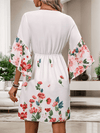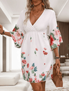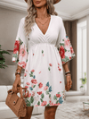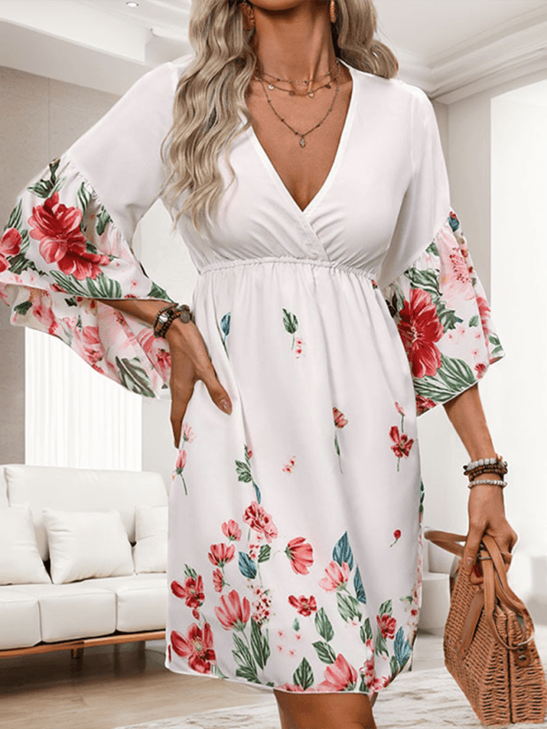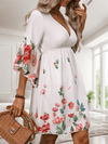 Deze elegante midi jurk met V-hals en bloemenprint biedt een stijlvolle en comfortabele pasvorm. Ideaal voor zowel casual als speciale gelegenheden, met een flatterende empire taille en driekwart mouwen.