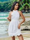 Deze verfijnde mini jurk met halterneck en gezoomde rand biedt een elegante en veelzijdige stijl. Perfect voor zomerse uitjes en strandactiviteiten, met een comfortabele pasvorm die verschillende lichaamstypes flatteert.
