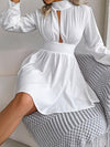 Deze stijlvolle mini jurk met hoge hals en uitgesneden taille biedt een elegante en moderne uitstraling. Perfect voor avondjes uit, met een flatterende pasvorm en chique effen kleur.