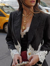 Deze stijlvolle mini jurk met V-hals en elegante kantdetails biedt een chique uitstraling. Perfect voor diverse gelegenheden, met een nauwsluitende pasvorm en gestreept patroon voor een verfijnde look.