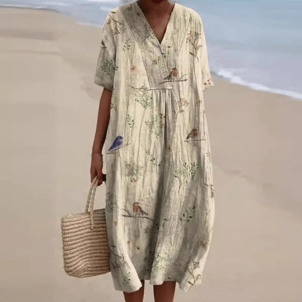 Ervaar de elegantie van deze 100% katoenen bloemenjurk met een vrolijk motief. Perfect voor elke gelegenheid dankzij de comfortabele en duurzame stof. Geniet van veelzijdigheid en stijl in één.