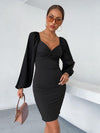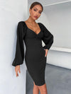 Deze elegante bodycon jurk met V-hals en lange puffmouwen biedt een flatterende pasvorm en een stijlvol silhouet. Perfect voor avondjes uit, met een effen kleur en moderne uitstraling.