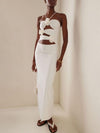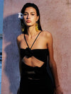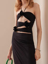 Deze elegante lange jurk met halterhals en unieke bloemdecoraties biedt een slanke pasvorm en gedurfde cut-outs. Perfect voor speciale gelegenheden, met een opvallend ontwerp dat je silhouet prachtig accentueert.