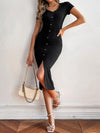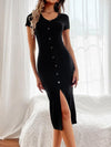 Deze chique lange jurk met V-hals en knopenlijst biedt een verfijnde uitstraling en comfortabele pasvorm. Ideaal voor zowel casual als formele gelegenheden, met een tijdloze effen kleur en elegante split.