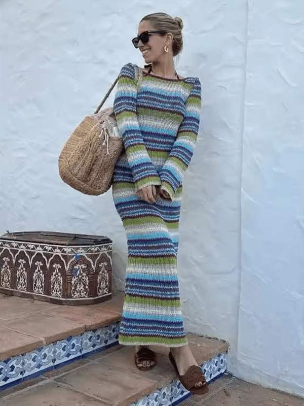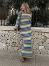 Deze stijlvolle maxi jurk met lange mouwen en gestreept patroon biedt een comfortabele en elegante pasvorm. Ideaal voor zowel casual uitjes als chique gelegenheden, perfect voor de koudere dagen.
