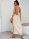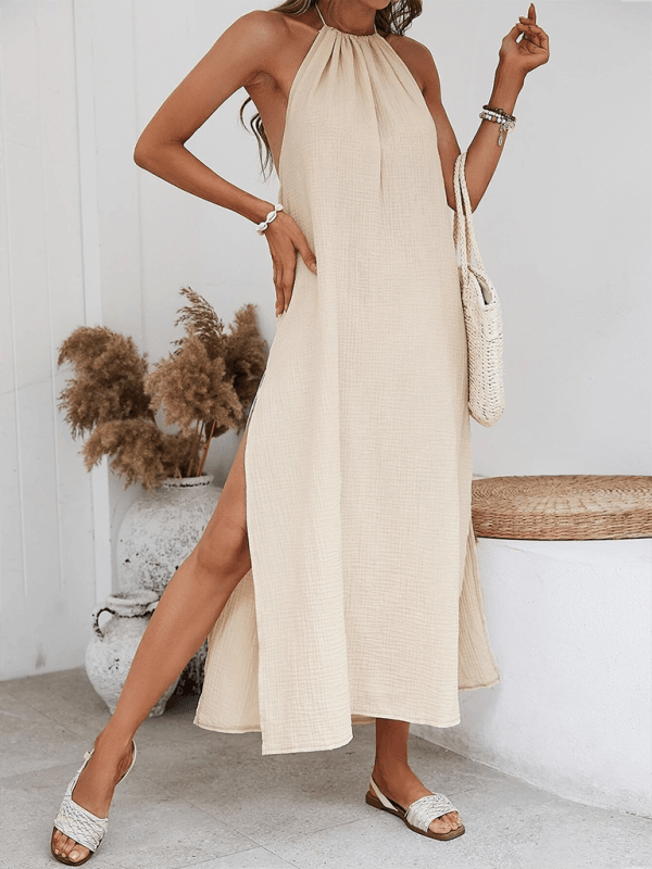 Deze stijlvolle maxi jurk met halterhals en rugloos ontwerp biedt een elegante en comfortabele uitstraling. Perfect voor strandvakanties en casual uitjes, met een veelzijdige en tijdloze stijl.