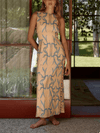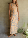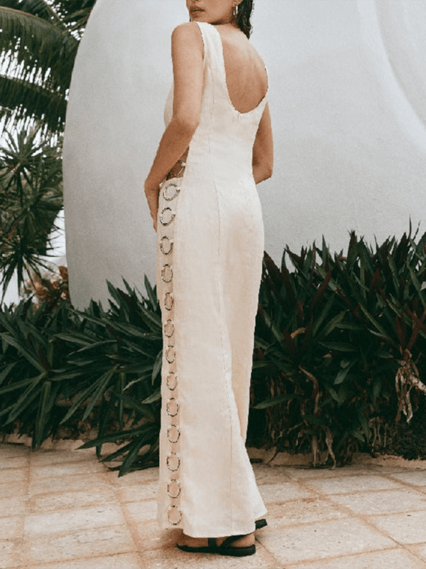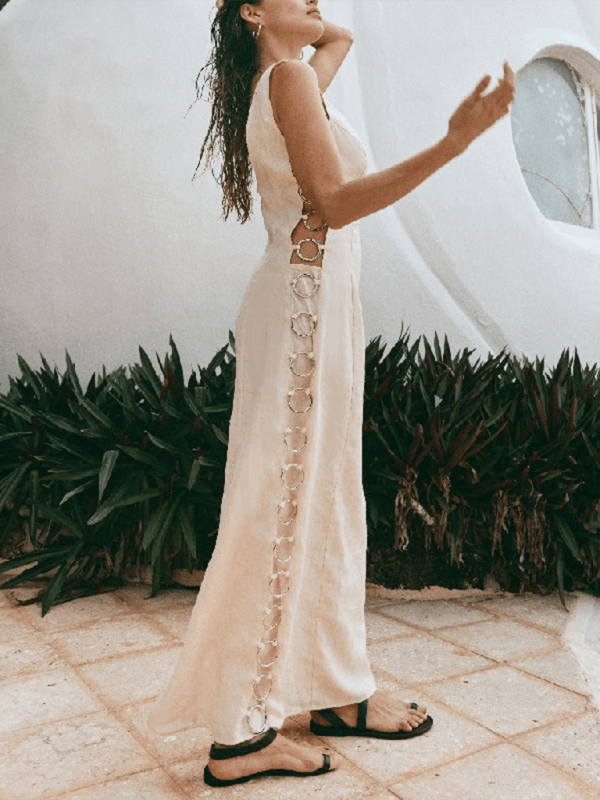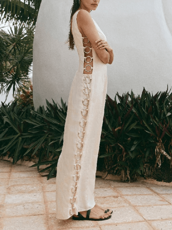 Deze elegante maxi jurk met hoge hals en decoratieve ringen straalt verfijning uit. Perfect voor chique daggelegenheden en stijlvolle avonden, met een slanke pasvorm die je silhouet accentueert.