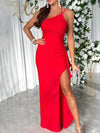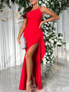 Deze stijlvolle maxi jurk in effen kleur heeft een elegante een-schouder stijl en een hoge split. De nauwsluitende pasvorm en rimpeldetails maken het perfect voor zowel casual feesten als chique avonden.