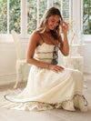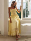 Deze elegante maxi jurk met rimpeldetails en kanten trim biedt een romantische uitstraling. Perfect voor bruiloften en tuinfeesten, met een flatterende A-lijn snit en elastische taille voor ultiem comfort.