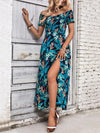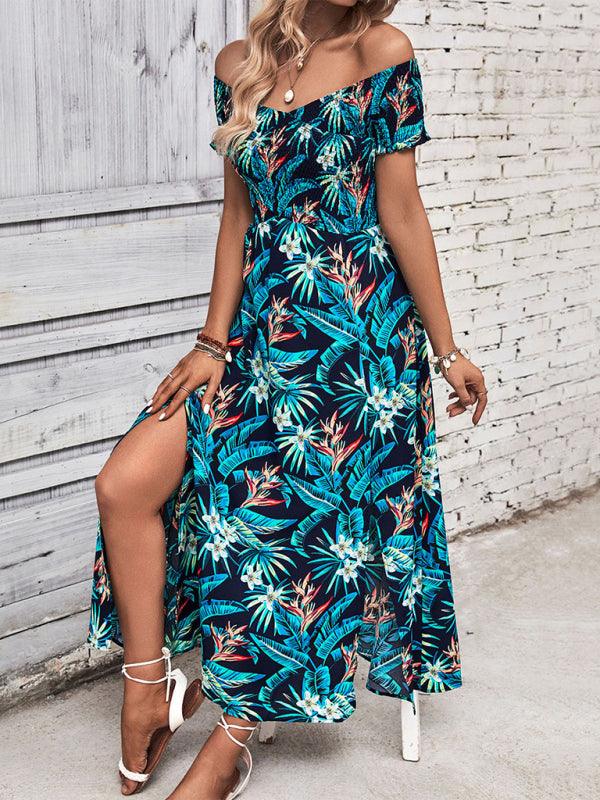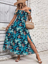 Deze luchtige maxi jurk met afneembare schouders en tropische bloemenprint is perfect voor zomerse dagen. De elastische tailleband en hoge split zorgen voor een comfortabele en trendy look, ideaal voor vakanties en stranduitjes.