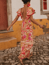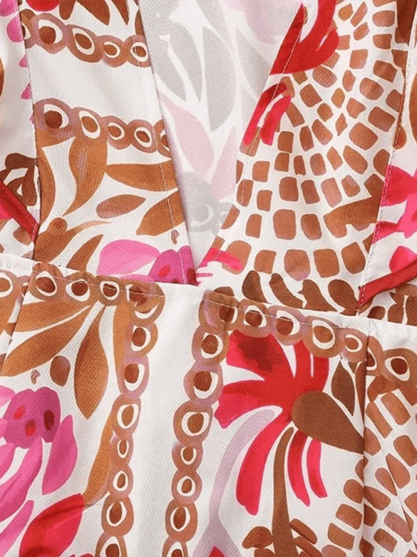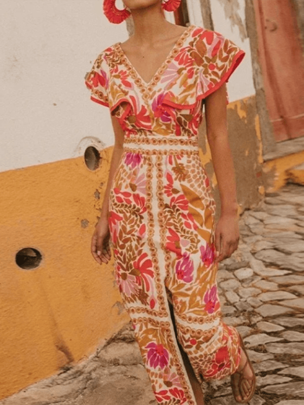 Deze elegante maxi jurk met V-hals en bloemenprint biedt een luchtige pasvorm en een bohemian uitstraling. Perfect voor zomerse gelegenheden zoals stranduitjes en tuinfeesten.