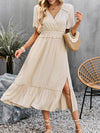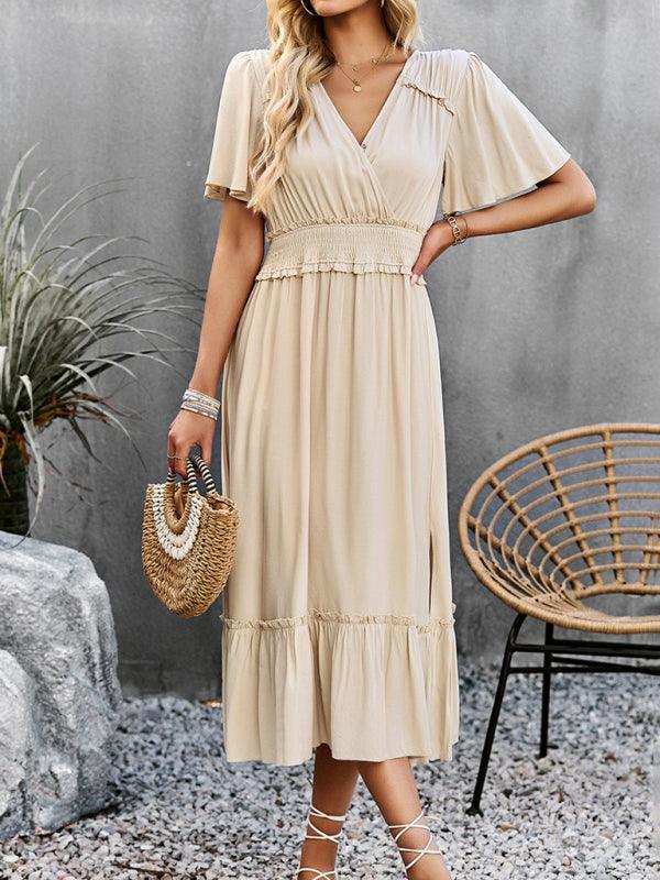 Deze elegante maxi jurk met V-hals en effen kleur biedt een stijlvolle en comfortabele pasvorm. Perfect voor zowel casual uitjes als chique avonden, met een flatterende elastische taille en zijsplit voor extra flair.