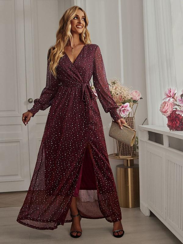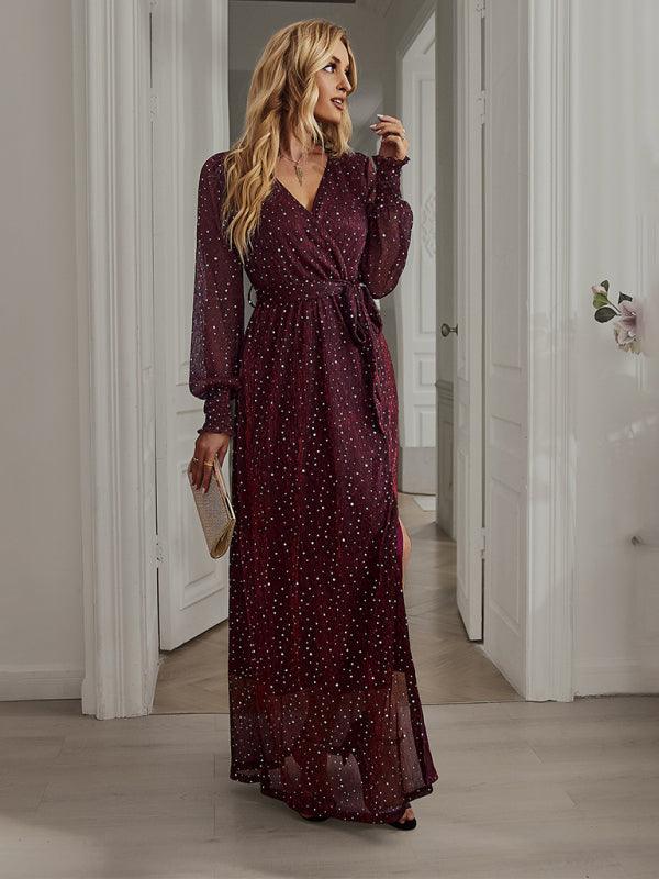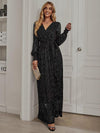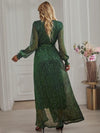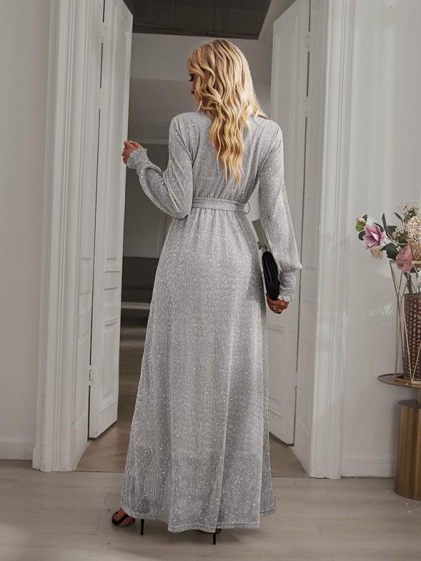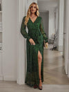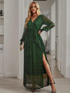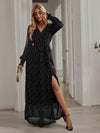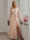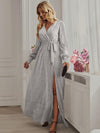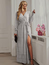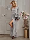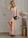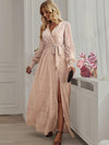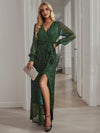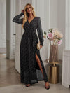Deze elegante maxi jurk met V-hals en hoge split straalt verfijning uit. Perfect voor formele evenementen, met een vrouwelijke pasvorm en comfortabele lange mouwen. Ideaal voor speciale gelegenheden.
