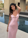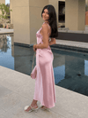 Deze luxueuze maxi jurk met V-hals en schouderbanden met strikdetails biedt een elegante uitstraling. De satijnen stof voelt heerlijk aan en is perfect voor formele avonden.