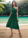 Deze stijlvolle midi jurk met een asymmetrische halslijn en plooirok biedt een elegante uitstraling. Perfect voor speciale gelegenheden, met een flatterende pasvorm en effen kleur die veelzijdig te combineren is.