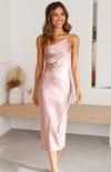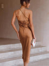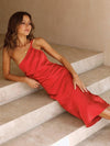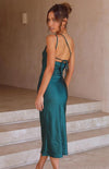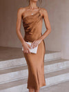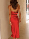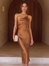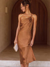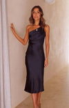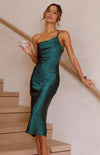 Deze luxe midi jurk van satijn met V-hals en asymmetrische strik is perfect voor speciale gelegenheden. De aansluitende pasvorm zorgt voor een elegante en flatterende look.
