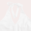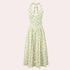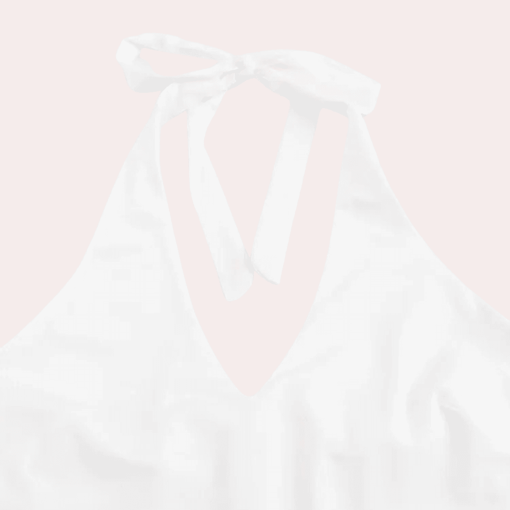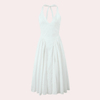 Deze elegante midi jurk met diepe V-hals en open rug is perfect voor speciale gelegenheden. Het halternekdesign en de geplisseerde A-lijn zorgen voor een flatterende pasvorm die comfort biedt op warme dagen.