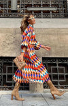 Deze stijlvolle A-lijn midi jurk met een geometrisch patroon en staande kraag biedt een elegante uitstraling. Ideaal voor zowel casual als semi-formele gelegenheden, met een comfortabele pasvorm en hoge taille.