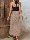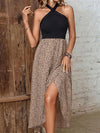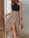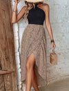 Deze stijlvolle midi jurk met halternek en dierenprint biedt een elegante uitstraling en comfortabele pasvorm. Ideaal voor zomerse uitjes en speciale gelegenheden, met een trendy A-lijn snit en onregelmatige split.