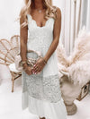 Deze elegante midi jurk met V-hals en intricate kanten details biedt een verfijnde uitstraling. Ideaal voor zomerse uitjes en formele gelegenheden, met een ademend en comfortabel ontwerp.