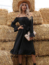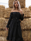 Deze elegante midi jurk met off-shoulder halslijn en ruches biedt een verfijnde uitstraling. Perfect voor speciale gelegenheden, met een flatterende pasvorm en hoge taille die de vrouwelijke lijnen accentueert.