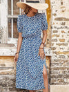 Deze charmante midi jurk met puff mouwen en bloemenprint biedt een elegante uitstraling. De hoge split en elastische taille zorgen voor een flatterende pasvorm, ideaal voor zomerse evenementen en casual uitjes.
