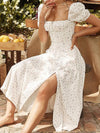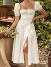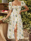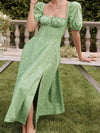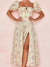 Deze romantische midi jurk met V-hals en hoge split biedt een elegante uitstraling. De puff mouwen en bloemenprint maken het perfect voor tuinfeesten en stijlvolle avonden. Comfortabel en veelzijdig voor elke gelegenheid.