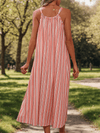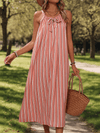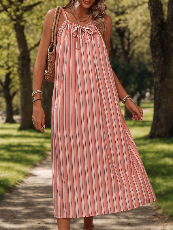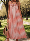Deze stijlvolle midi jurk met strikdetail en gestreept patroon biedt een luchtige pasvorm en een elegante uitstraling. Perfect voor casual uitjes en zomerse dagen. Midi jurk, gestreept patroon, V-hals, casual stijl, strandjurk, luchtige pasvorm, damesmode, trendy jurk, zomerjurk, elegante uitstraling.
