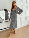 Deze elegante midi jurk met V-hals en bloemenprint biedt een verfijnde uitstraling en comfortabele pasvorm. Ideaal voor zowel casual als semi-formele gelegenheden, met een stijlvolle open rug en lange mouwen.