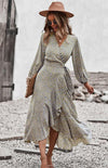 Deze elegante midi jurk met V-hals en bloemenprint biedt een flatterende pasvorm en luchtige mouwen. Ideaal voor zowel casual uitjes als speciale gelegenheden, met een strikceintuur en plooirok voor een veelzijdige stijl.