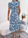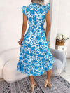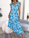 Deze charmante midi jurk met V-hals en blauwe bloemenprint biedt een elegante en comfortabele pasvorm. Ideaal voor zomerse uitjes en casual gelegenheden, met een flatterende tailleband en speelse rimpelmouwen.