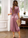 Deze elegante midi jurk met V-hals en korte mouwen biedt een tijdloze uitstraling. De effen kleur en comfortabele pasvorm maken het perfect voor zowel dagelijks gebruik als speciale gelegenheden.