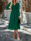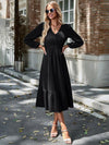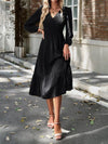 Deze verfijnde midi jurk met V-hals en lange mouwen biedt een tijdloze uitstraling. De elastische taille en meerdere lagen in de rok zorgen voor een comfortabele pasvorm, ideaal voor speciale gelegenheden.