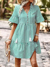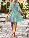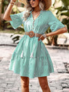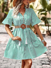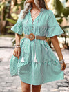 Deze stijlvolle midi jurk met V-hals en luchtige mouwen biedt een comfortabele pasvorm. Ideaal voor zowel dagelijkse als zomerse gelegenheden, met een speels gestreept ontwerp dat eenvoudig te combineren is met accessoires.