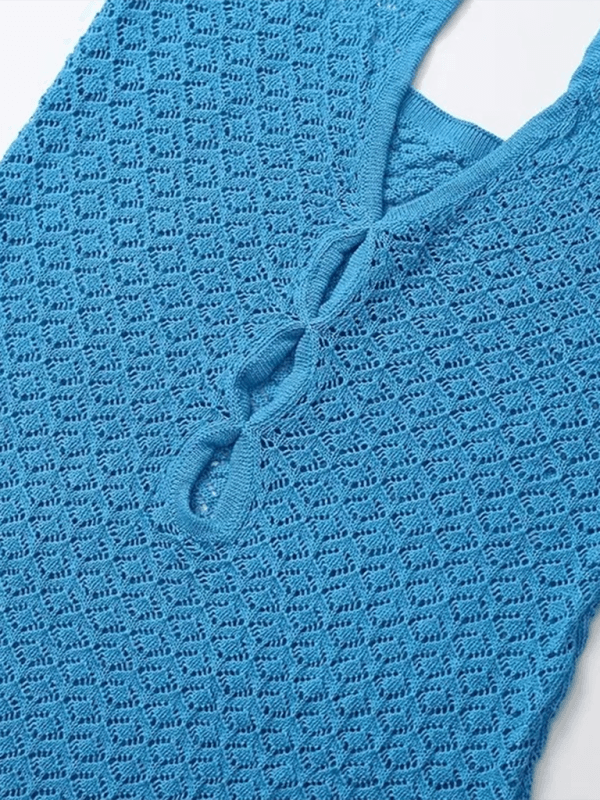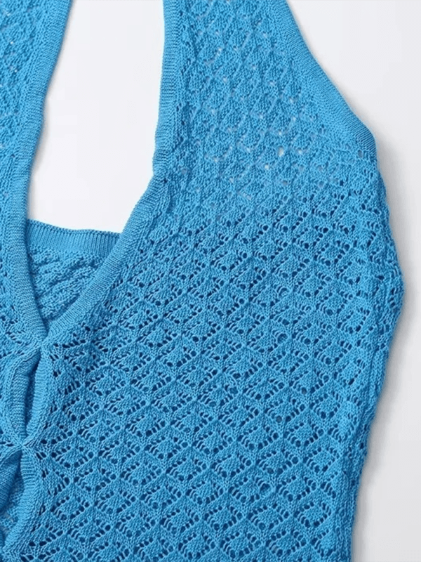 Deze stijlvolle midi jurk met V-hals en halternek biedt een elegante en comfortabele pasvorm. Perfect voor zomerse dagen en stranduitjes, met een effen kleur die veelzijdig en modieus is.