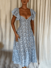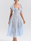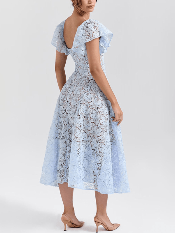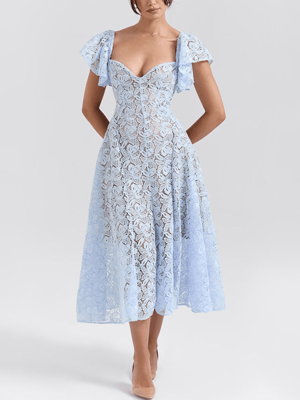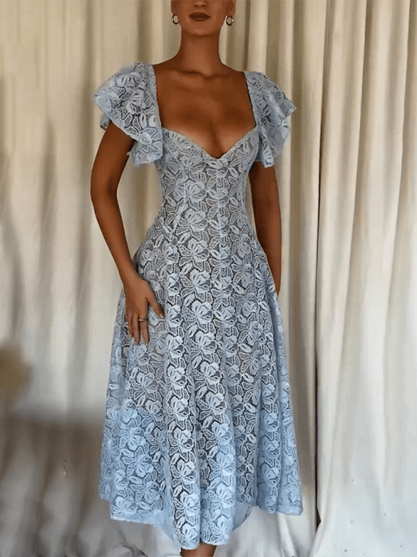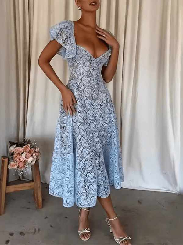Deze elegante midi jurk met V-hals en kanten bloemenprint biedt een verfijnde uitstraling. Perfect voor bruiloften en stijlvolle avonden, met een nauwsluitende pasvorm die vrouwelijkheid benadrukt.