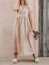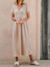 Deze elegante midi jurk met V-hals en knopenlijst biedt een comfortabele en stijlvolle uitstraling. Perfect voor zowel casual als semi-formele gelegenheden, met een losse pasvorm en effen kleur die veelzijdig te stylen is.