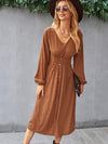 Deze stijlvolle midi jurk met V-hals en luchtige mouwen biedt een elegante uitstraling. De elastische tailleband accentueert de taille, ideaal voor zowel casual als formele gelegenheden.