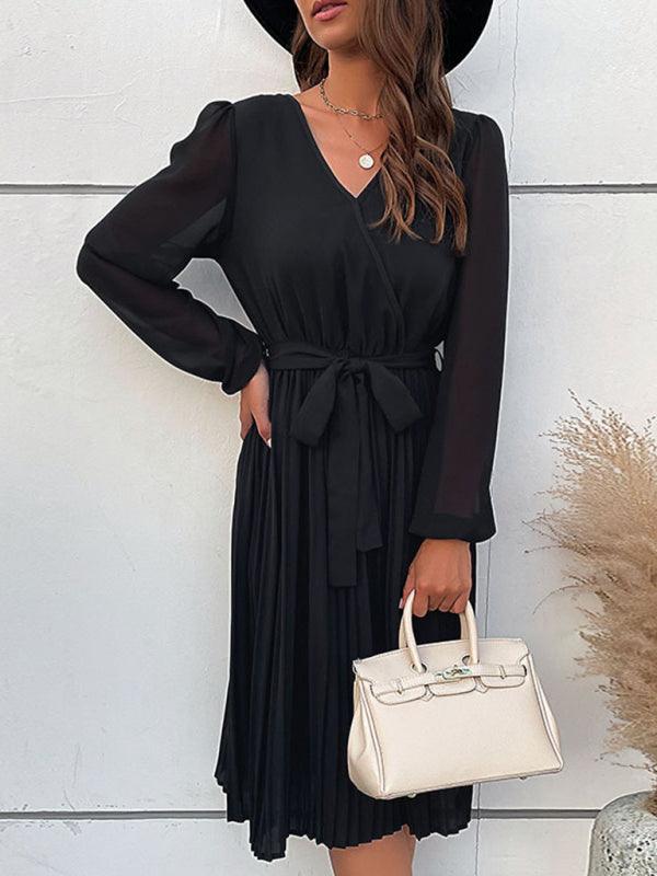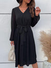 Deze elegante midi jurk met V-hals en plooirok biedt een stijlvolle en comfortabele pasvorm. Perfect voor zowel formele als casual gelegenheden, met een strikceintuur die de taille flatteert.