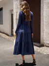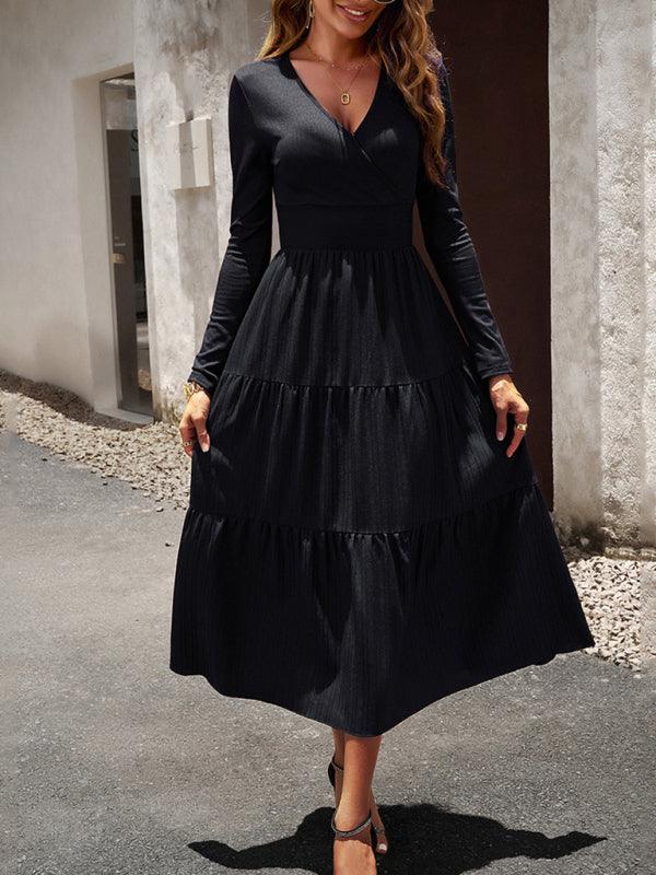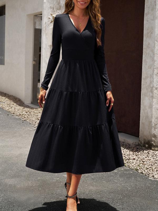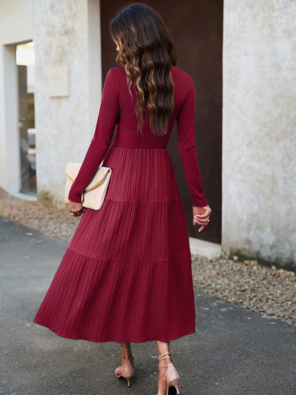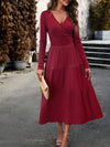 Deze elegante midi jurk met V-hals en plooirok biedt een tijdloze uitstraling en ultiem comfort. Perfect voor zowel formele gelegenheden als dagelijks gebruik, met een flatterende hoge taille en effen kleur.