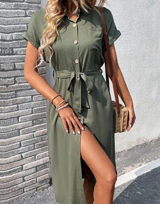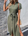 Deze stijlvolle midi jurk met V-hals en strikceintuur biedt een comfortabele pasvorm voor elke dag. De effen kleur en klassieke snit maken het perfect voor zowel casual als formele gelegenheden. Midi jurk, V-hals, effen kleur, casual stijl, strikceintuur, korte mouwen, dagelijkse outfit, tijdloos ontwerp, comfortabele pasvorm, damesmode