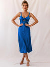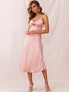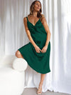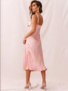 Deze elegante midi jurk van luxe satijn heeft een V-hals en strikdetail op de schouderbanden. De flatterende pasvorm is perfect voor formele evenementen en biedt een chique uitstraling.