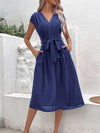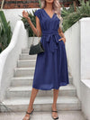 Deze stijlvolle midi jurk met V-hals en tailleband biedt een elegante uitstraling en comfortabele pasvorm. Ideaal voor zowel casual als feestelijke gelegenheden, met handige zakken voor extra gemak.