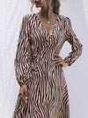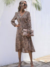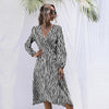 Deze elegante midi jurk met V-hals en opvallende zebraprint biedt een veelzijdige stijl voor zowel casual als formele gelegenheden. De lange mouwen en eenvoudige taille zorgen voor een verfijnde uitstraling.