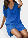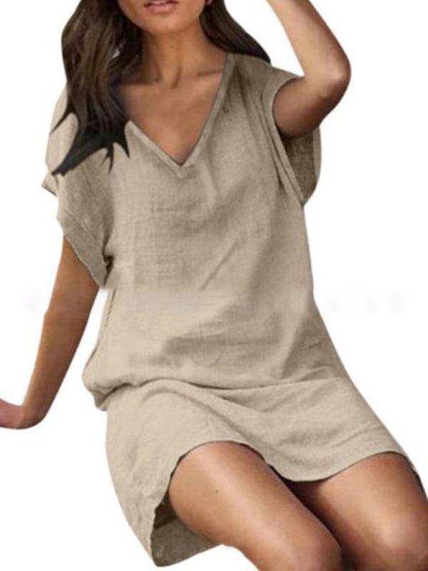Deze luchtige midi jurk met V-hals biedt een casual en comfortabele stijl. Gemaakt van ademend katoen-linnen, ideaal voor zomerse uitjes en eenvoudig te combineren voor een ontspannen look.