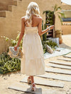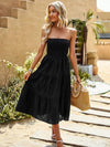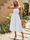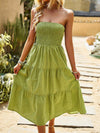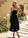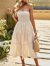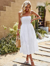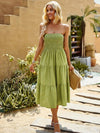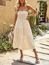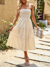 Deze stijlvolle midi jurk zonder schouderbanden heeft een elastisch lijfje en een gelaagde rok. Perfect voor zomerse dagen en casual uitjes, met een comfortabele pasvorm en elegante uitstraling.